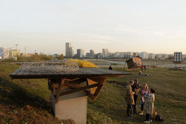 On the ridge of utopia and dystopia, gentle waves on the lake, fine lines in the calculus of political decisions, market-oriented, forward-looking. The feeling of the last city. Cornfields in front of real renderings, littering by the lake, a shimmer and glitch of a recurring building. The no DREAM ESTATE nation, a place that faces the future, or what may comes after it; the wild ones of Aldous Huxley, the no nation people. The accomplished DREAM ESTATE, a formation of concrete pedestals, each weighing several tons and with rotated roof structures on top. Based on the concept of Reinhold Zisser. Planned and executed by Rainer Stadlbauer, both part of TEAM DREAM ESTATE. The new platforms stand in a dialogue with the former Notgalerie, the cultural pioneer which disappeared. The exhibition curated by Karin Pernegger and Reinhold Zisser is a record of a long breath. Unchangeable but perhaps quite different again, the conviction manifests itself in the substance and shows its property of changing aggregate at lightning speed. no DREAM ESTATE nation is written on Katrin Plavcak's banner. It features her work "Proposal for a sculpture in public space" from 2006, which shows an interrupted tubular form running horizontally through the pictorial space. The background shows a panorama of a construction site, comparable to the site of the Notgalerie and the Seestadt. As a flag at a height of about 10 metres, the pictorial subject frames and opens the overall exhibition of the DREAM ESTATE.